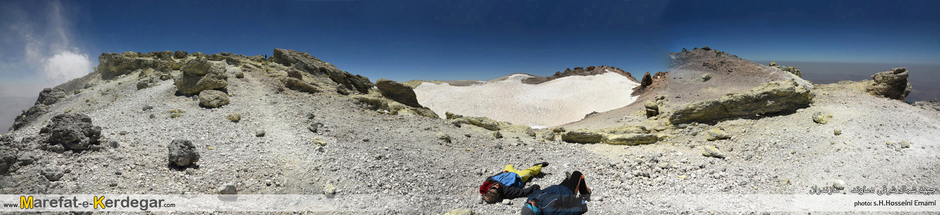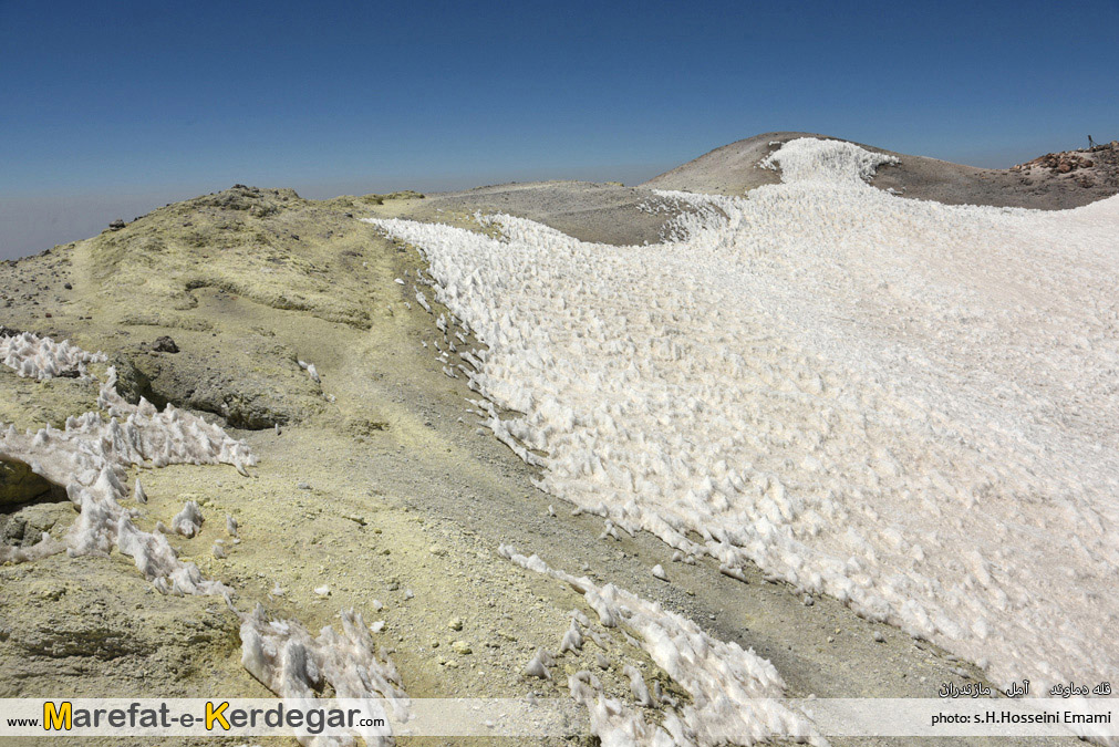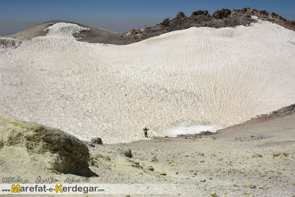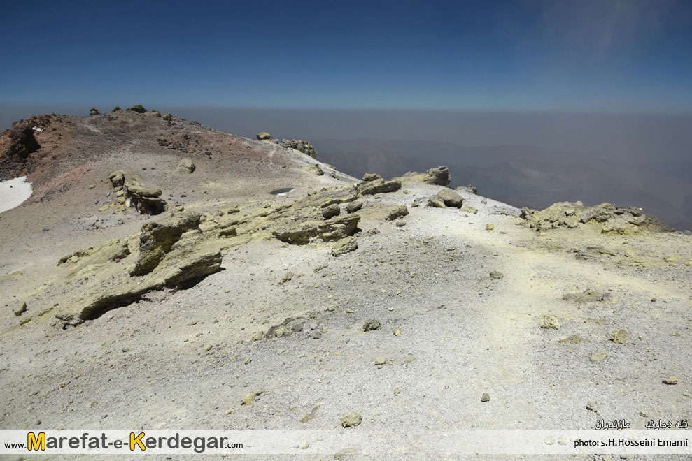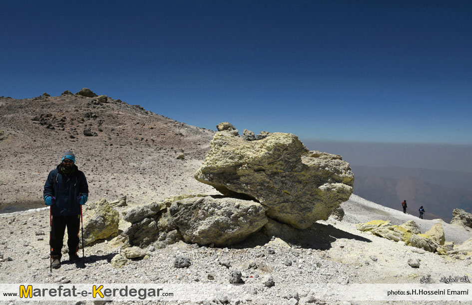 رفته رفته، سنگ های زرد رنگ و گوگردی که نشانۀ قله دماوند هست، رؤیت می شوند و این یعنی ما تا قله، راه زیادی نداریم. در حالی که تقریبا به زیر قله رسیده ایم، مسیر ما با مسیر صعود جبهه شمالی، یکی می شود. از آن جا شما فقط باید 10دقیقه پیمایش کنید تا کاسه قله دماوند، دیده شود.