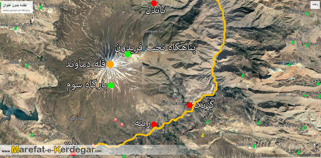موقعیت مسیر صعود قله دماوند، از جبهه شمال شرقی بر روی تصویر مشخص شده است.