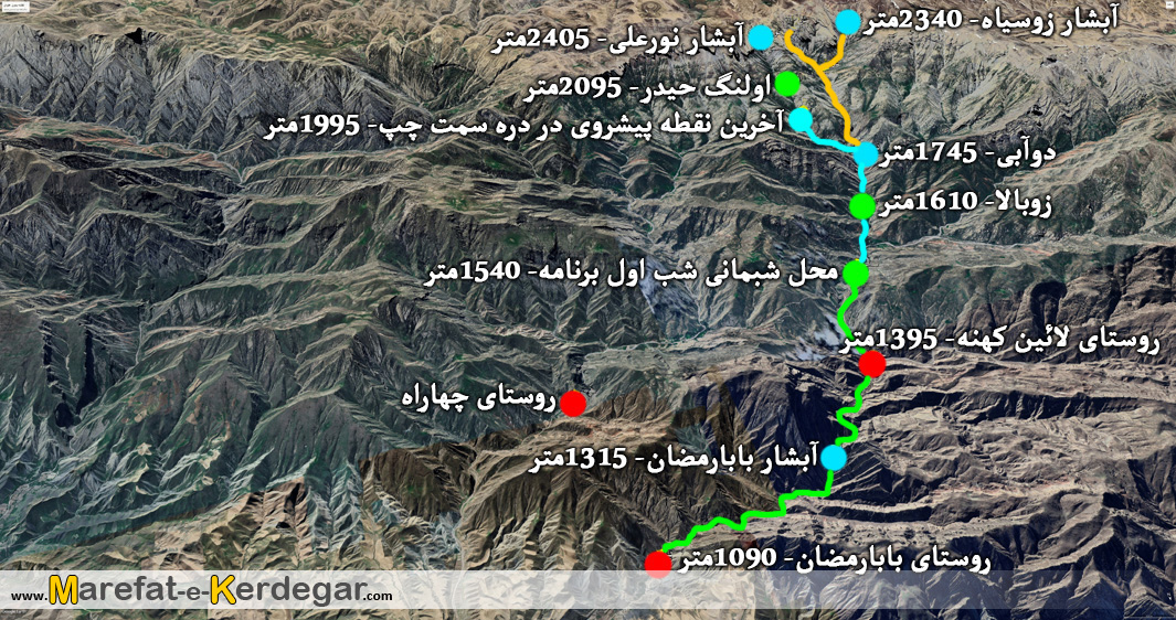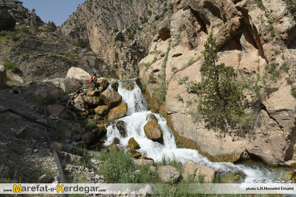 خیلی سریع و با گذاشتن کوله ها در محل دوآبی، با یک کوله سبک، وارد دره سمت چپ می شویم که منتهی به آبشار نورعلی می گردد.