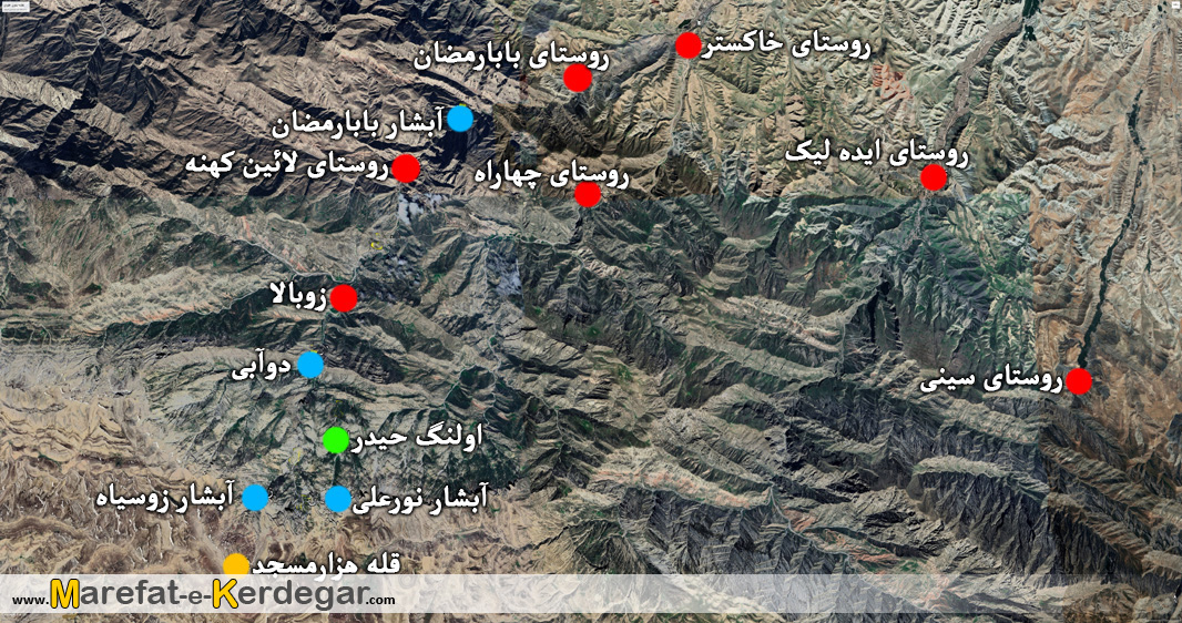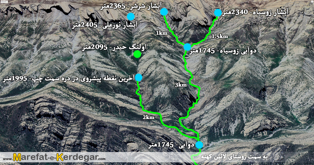 این دوآبی، یک سمت آن، به اولنگ حیدر و آبشار نورعلی و سمت دیگر آن نیز، به آبشارهای زوسیاه، ختم می گردد. فاصله لائین کهنه به دوآبی، 7کیلومتر و 500متر و فاصله زوبالا به دوآبی، 2کیلومتر می باشد.