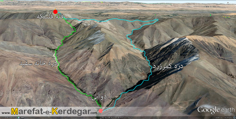 در ابتدا به دوآبی می رسیم که یک ساعت زمان می بَرَد. ارتفاع دوآبی، 1900متر می باشد. درۀ سمت چپ، خانه سفید و درۀ سمت راست، کمر زرد نام دارد. طبق برنامه ریزی قبلی، قرار است که ما از درۀ خانه سفید، قلۀ فلسکه را صعود کرده و از درۀ کمر زرد بازگردیم.